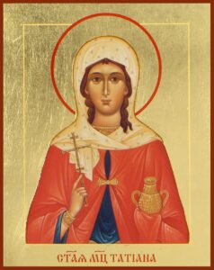 Святая Татиана, дочь знатного римлянина-христианина, с юности избрала путь служения Богу и Церкви, была поставлена диакониссой и посвятила себя молитве, помощи больным и нуждающимся. Во время гонений III века она проявила непоколебимую веру и мужество: не устрашилась пыток, по её молитвам разрушались идолы и обращались ко Христу сами гонители. Приняв мученическую кончину, святая Татиана стала символом твёрдого исповедания веры и всепобеждающей любви к Господу. В России её память особо почитается в день основания Московского университета, и она считается покровительницей студенчества.