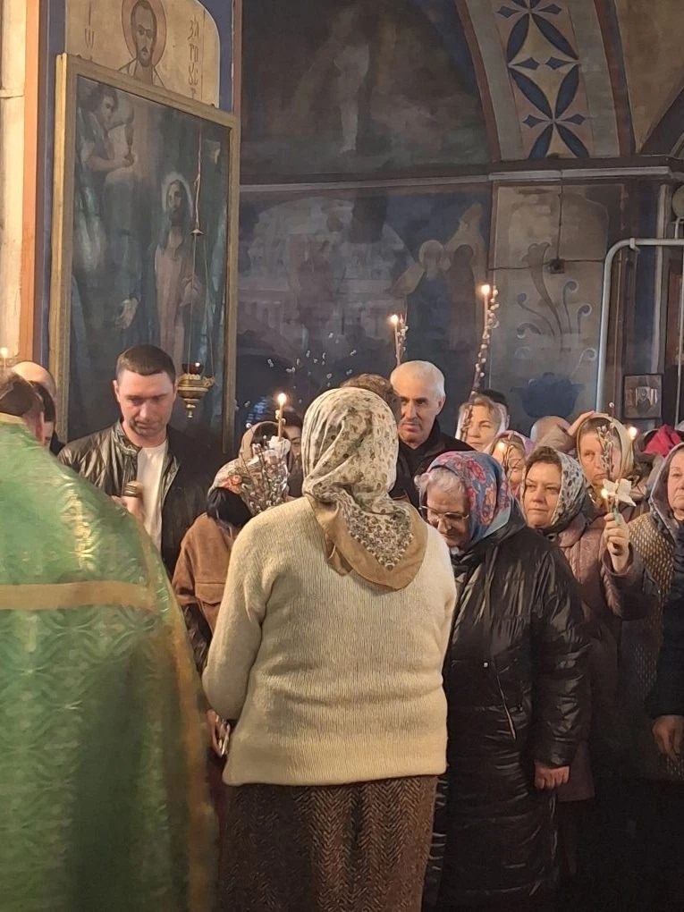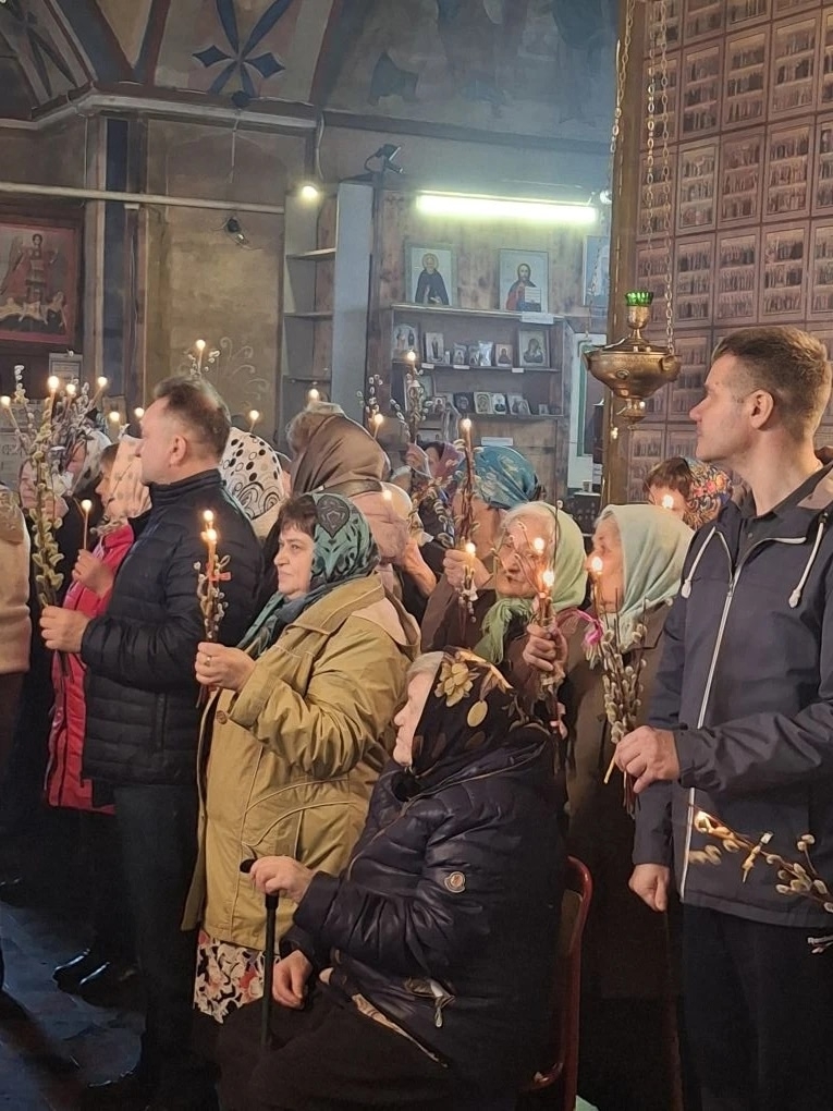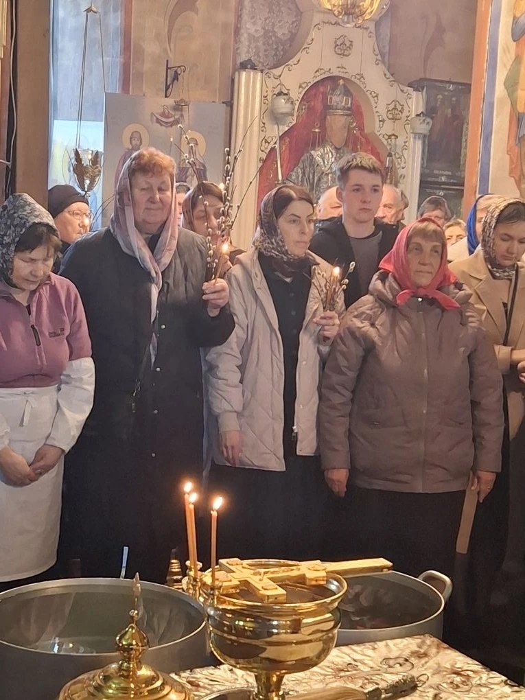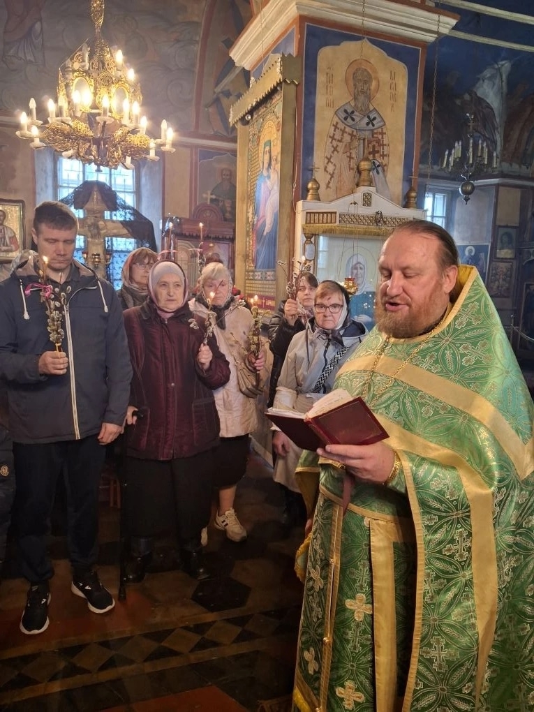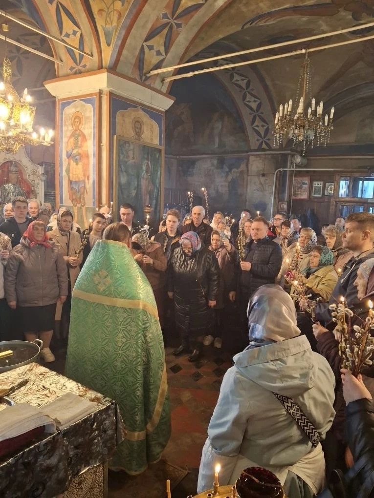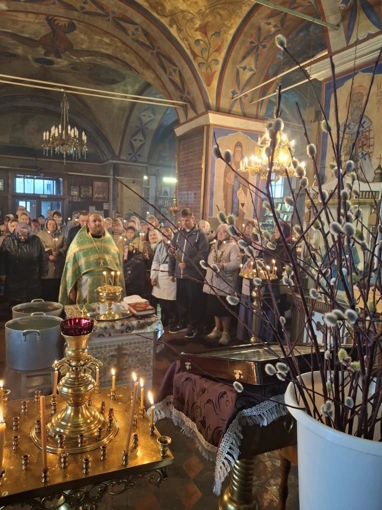 Храм был полон молящихся – прихожане и паломники собрались, чтобы разделить радость двунадесятого праздника. После чтения Евангелия отец Сергий совершил освящение верб (ваий) и молебен. За Литургией многие приступили к Святым Христовым Таинам.